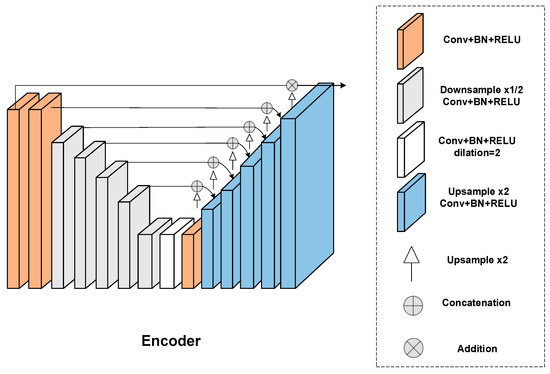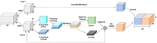 The above two transformations aggregate feature maps along the channels, respectively, to obtain a pair of direction-aware feature matrices . Then, is transposed and concatenated by , and is operated by convolution, normalization, and a non-linear activation function. Where [ ] is the concatenate operation along the channels, denotes a series convolution, batch normalization, denotes the activation function, and denotes the output.