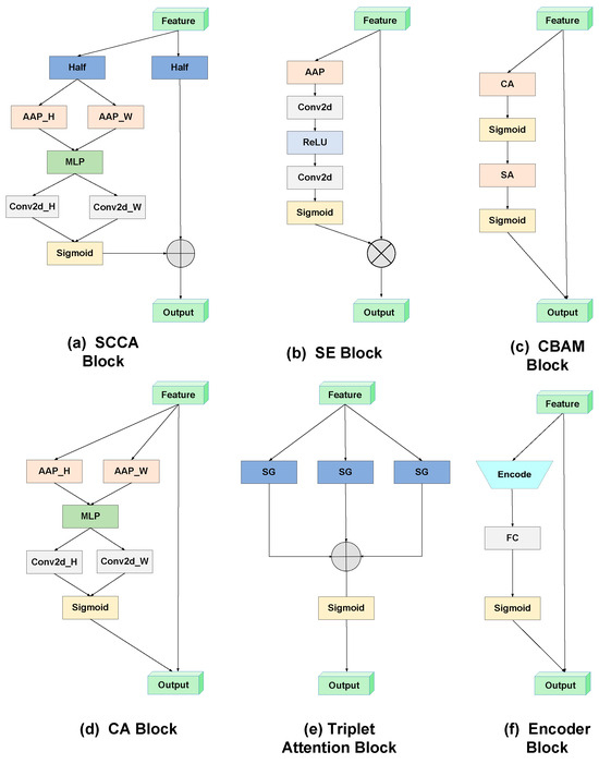 The split ratio of the squeeze block and the kernel size of spatial attention in the CBAM is set as 16 and 7 × 7, respectively. The average transformation and the ratio used in SE is adaptive average pooling and 2, respectively. The reduction ratio in the SCCA, CA is 4, and the kernel size of the convolution of line 1 in the SCCA is 3 × 3. The overall architecture of attention modules is depicted in Figure 6.