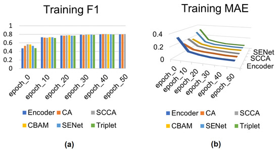 Training results of the DUTS dataset with added attention modules: encoder, CA (channel attention), SCCA (split coordinate channel attention), CBAM (convolutional block attention module), SE (squeeze-and-excitation Network), and triplet. (a,b) shows the comparison results of F1-score and MAE, respectively.