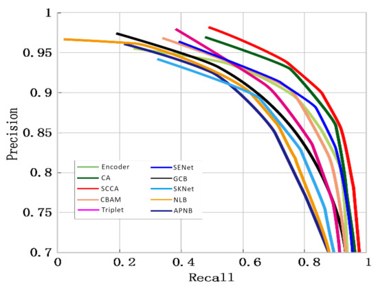 The proposed SCCA module is compared with nine existing state-of-the-art methods. For a fair comparison, different methods are trained using the same parameters. The number of batches, weight decay, number of training rounds, and initial learning rate are set to 16, 1 × 10−4, 50, and 1 × 10−3, respectively. The top-three outstanding performers under the single measure are highlighted in bold. The comparison results are shown in Figure 9 and Table 1.