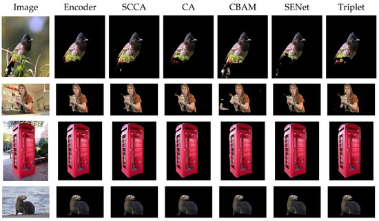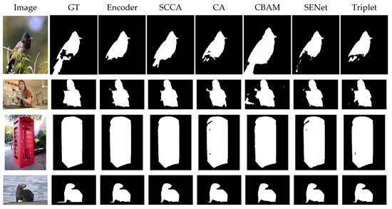 In the experiment, six attention modules, namely, encoder, SCCA, CA, CBAM, SENet, and triplet, were chosen for visualizing the detection results. Figure 11 displays the detected salient objects using an RGB color map, while Figure 12 shows the detected salient objects using a black-and-white binarized image. For the bird detection results, SCCA can accurately detect the bird entity. However, encoder, CA, and triplet cannot detect the tail of the bird. Although CBAM can detect the bird entity, it is unable to detect the size of the bird. SCCA can accurately detect the woman holding the cat, eliminate noise interference, and outline the woman and the cat. All attention modules perform well in the phone booth detection, but only the predictions of SCCA and encoder which have no gap in the middle of the phone booth are close to the ground truth. When it comes to detecting small sea lions, all attention modules show similar detection effects.