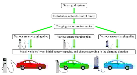 The ordered charging framework of EVCs is composed of a distribution network control center, a charging station control center, and intelligent charging piles. The specific ordered charging framework of EVCs is shown in Figure 1: