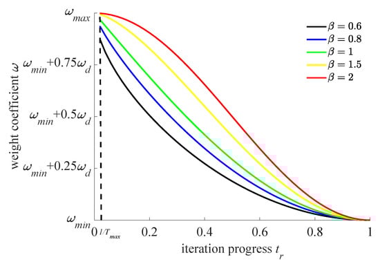 where is the decreasing amount of the weight coefficient, , and are the minimum and maximum value for the weight coefficient, respectively; is the iteration progress, ; is the optimization factor [20].