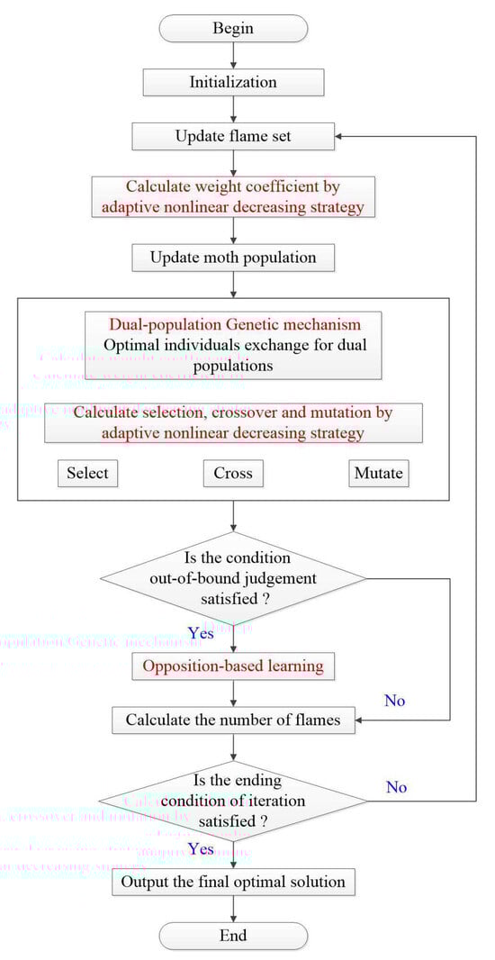 To improve the issue that the MFO easily falls into local convergence, this work integrates the dual-population genetic mechanism, and the purpose of this is to improve the global optimization performance of MFO with the help of a dual population. In the iterative process, the MFO quickly draws each moth closer to the current optimal flame, which provides direction guidance for the evolution of the genetic moth–flame population and is conducive to accelerating convergence and global optimization. Meanwhile, due to the existence of a dual genetic mechanism, the moth population will not immediately stop searching for optimization when it falls into local extremum. The three operators of crossover, selection and mutation cause a certain degree of evolutionary disturbance in the evolution process of the moth population, which will help it escape the dilemma of local convergence and enhance its global optimization performance [18]. Conventional genetics cannot compare with dual population in global optimization performance. In the long iterative phase of the conventional genetic mechanism, the optimal individual has a certain degree of “domination” over the population, which makes it difficult for the algorithm to realize the global convergence. However, under the dual population scheme, the optimal individuals of two populations can carry out the action of exchange, and owing to the changes in the population environment, the optimal individual of original populations easily loses the long-established “dominant” position.