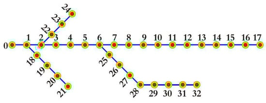 In this work, the EV OCP optimization example about the Dalian bonded area scenic spot is taken as the research object. The Dalian bonded area scenic spot is one of the Chinese economic and technological development zones. The EV OCP optimization simulation environment is built with real data sources for the Dalian bonded area scenic spot. IEEE-33 network is a standard IEEE network, and IEEE-33 network topology with security and steadiness is popularly used in electric vehicle traffic network construction [11]. In this paper, IEEE-33 network topology is selected. There are 33 nodes in the smart grid of this district, and the type, applicable voltage range and voltage phase of each node have been identified, and the resistance between each node is known. The specific load data of the IEEE-33 smart grid system are shown in Table 1, and the specific the IEEE-33 smart grid system diagram is shown in Figure 4.