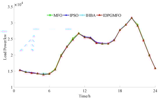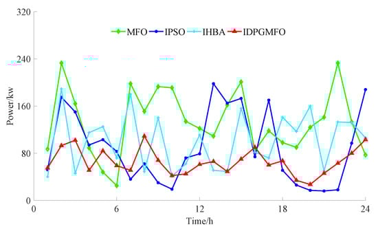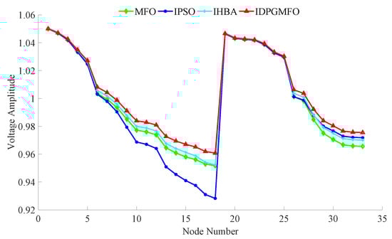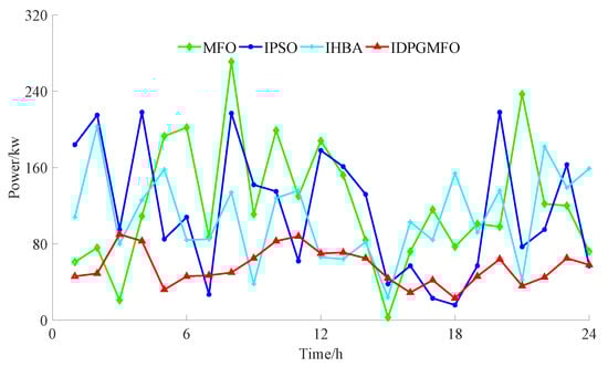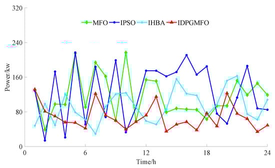 As can be seen from Figure 5, compared with comparison optimization algorithms, the IDPGMFO has a faster global convergence speed and better global convergence accuracy under the condition of taking into account the preferences of charging users and the quality of the power grid. As can be seen from Figure 6, Figure 7 and Figure 8, compared with comparison optimization algorithms, the improved PSO and the improved honey-badger algorithm used for comparison, the operation plan curves of charging stations 1–3 obtained by the IMFO are more straight, and it is beneficial to reduce line loss power. It can be seen from Figure 9 and Figure 10 that when considering the preferences of charging users and the quality of the power grid, compared with comparison optimization algorithms, the IMFO can better realize “peak and valley filling” to effectively ensure the load stability of the power grid and reduce the network loss more significantly. As can be seen from Figure 11, when considering the preferences of charging users and the quality of the power grid, compared with comparison optimization algorithms, the node voltage amplitude of 33 nodes for the planning scheme obtained by the proposed IDPGMFO in this paper belongs to the range of 0.96–1.05, and its fluctuation is small.
