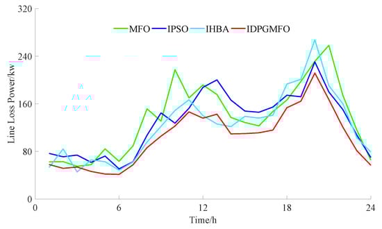 Figure 5 is used for evaluating the optimization algorithm ability throughout the whole process. The evolutional generations and fitness values are pure numerical values without units. Figure 6, Figure 7 and Figure 8 are used to show the final ordered charging planning of charging stations 1–3 obtained by proposed IDPGMFO and comparison optimization algorithms. The unit of power is kW, the unit of time is h, of course, the time total number is 24. Figure 9, Figure 10 and Figure 11 are used to show the grid side comprehensive performance for the final ordered charging planning obtained by the proposed IDPGMFO and comparison optimization algorithms. The unit of load power and line loss power is kW, while the node number and voltage amplitude are pure numerical values without units.