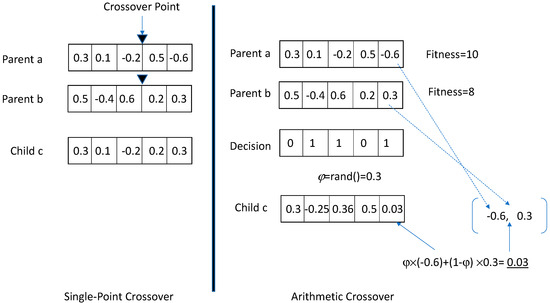 One of the benefits of the loose bound from Equation (10) is that it is independent of the crossover rate or type of crossover operations used in the GA. This means that different crossover operations can be used, and the mutation-driven loose bound from Equation (10) will still hold for these different crossover operations. As a result, this research uses two crossover operations. The first crossover operation is the single-point crossover operation described earlier. The second crossover operation is the arithmetic crossover [7]. Figure 1 illustrates the two crossover operations used in this research. As explained before, the single-point crossover picks two parents, a random crossover point, and it creates a child with genes containing the genes from the head of the first parent until the crossover point and genes from the tail of the second parent after the crossover point. The critical point to notice in this crossover is that the child’s genes take values from those appearing in two parents. The arithmetic crossover selects two parents using the selection operation and then considers the fitness values of the two parents. The higher-fitness parent becomes the base parent, whose genes will be retained unless the decision vector suggests a decision to change its genes. The decision vector, with a dimensionality equal to the number of genes, is a binary vector that selects a value of 0 or 1 with equal probability. For genes where the decision vector takes a value of 0, the higher-fitness parent’s genes are retained in the child. For genes where the decision vector takes a value of 1, the child’s gene (θci) is replaced by a computed value, which is a weighted average of the respective genes of the two parents. The weights in this weighted average are assigned by generating a random number φ∈(0, 1) and averaging respective genes from the parents using the following formula: