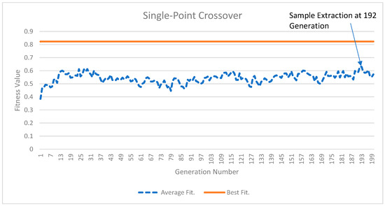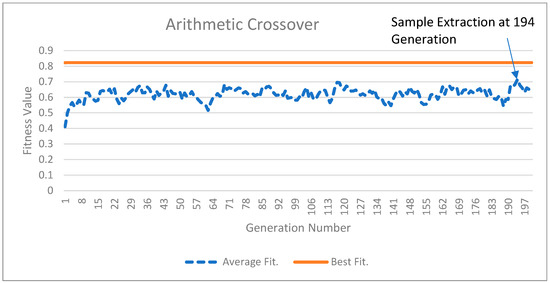 Figure 2 and Figure 3 illustrate the results of the GA experiments for two crossover operations. In both Figure 2 and Figure 3, the top solid line is the best-fitness population member and the dotted line is the average population members’ fitness. While the top line appears straight, minor improvements in the best population member fitness occur. For Figure 2, the best population member fitness value improves from 0.823015 in the 1st generation to 0.823325 in the 200th generation. In Figure 3, these numbers are 0.822516 and 0.823437, respectively. The average fitness values for the posterior distribution sample extracted at the 192nd generation from Figure 2 and the 194th generation for Figure 3 were 0.631558 and 0.714597, respectively. The higher average fitness value for the sample extracted from Figure 3 suggests that arithmetic crossover results are better and will provide a greater percentage of IW improvement (PIWI) from Equation (15). The reader may also visually observe the gap between the average population fitness values and the best fitness population member values. This gap is lower in Figure 3, indicating that arithmetic crossover results are better than single-point crossover results.