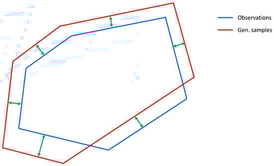 An open question is how to compare the difference between the Tukey depth contours of the observations and the generated samples. One natural and powerful metric is Intersection over Union (IoU) [], which is highly popular for comparing segments in image analysis. However, in this paper we use the computationally simpler alternative of computing the difference between the contours in the directions defined by . This is illustrated in Figure 3. The red and blue lines show an illustration of a TDC computed from a set of observations and generated samples for . The regions within the lines are the -depth regions. The green arrows show the difference between the TDCs along the directions .
