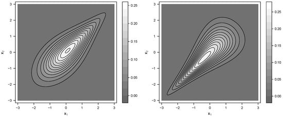 The distribution refers to a bivariate distribution with standard normal marginal distributions and dependency given by the Gumbel copula with . The distribution is equal to except that the dependency is by the Clayton copula with . A short introduction to copulas and details on the Gumbel and Clayton copulas are given in Appendix A. Figure 4 shows contour plots of the distributions and .
