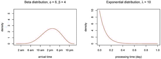 In addition, we assumed that the true values of the unknown parameters were and so that almost all arrivals (CPU requests) will take place from 5 a.m. to 10 p.m., as shown in the left panel of Figure 7. The processing time for each request was assumed to follow the exponential distribution with rate , as shown in the right panel of Figure 7. These parameter values were used to generate a synthetic dataset, and the aim was to use the ABC rejection algorithm with TDC statistics, as described above, to estimate the parameter values used to generate the synthetic dataset.