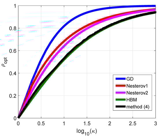 In addition, we try to compare the optimal convergence rate as a function of for method (4) with the optimal rates for the GD method (2), the HBM (3), and the following Nesterov methods: