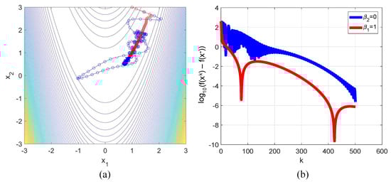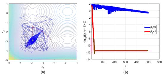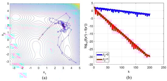 which has four local minima, the following parameters were used: , , . For the initial point both methods converged to the local minimum . The trajectories are presented in Figure 4a, and the plots of the error logarithm are presented in Figure 4b. As can be seen, the damping effect realized with the proper choice led to a faster convergence in comparison with the standard HBM.