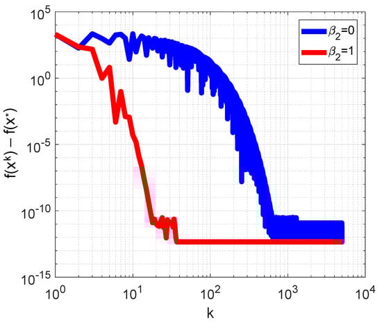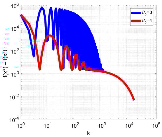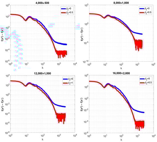As mentioned in [34,35] , where , . Datasets, represented by A and b at various values of m and d were simulated using the function randn() in Matlab: matrix A was simulated as a random matrix from the Gaussian distribution normalized by , and b was simulated as a random vector from the same distribution. Computations were performed with the following parameter values: , . Steps h and were computed as optimal values for the quadratic case, and was chosen to as equal to 0.5. Condition number for all model datasets was approximately equal to . The error was computed as , where was the benchmark solution, obtained by method (4) for iterations. For all cases, was chosen as a vector of units. In Figure 10, the plots of the dependence of error on the iteration number are presented in log–log axes. As can be seen, the presence of led to an improvement in convergence.