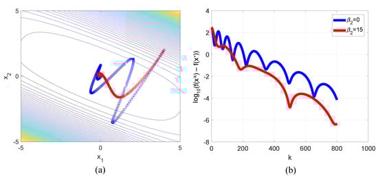 This function has a minimum at the point . For the numerical simulation, we used the following values: , , , . The descent trajectories for the methods (3) and (4) are presented in Figure 3a. The plots of the dependence of the logarithm of error, computed as on the iteration number are presented in Figure 3b. From both figures, it can be seen that the inclusion of led to the damping of oscillations typical for the HBM, and, as a consequence, to a faster entry of the trajectory in the neighborhood of the minimum point.
