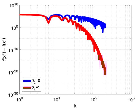 - Nesterov’s accelerated gradient method for a strongly convex quadratic function (Nesterov2) [28]:The numerical solution to problem (19) is realized using the same method as for problem (21), but for the Nelder–Mead method, four ’good’ points are obtained with a random search. The interval on is bounded by 0.5, according to the behavior, illustrated in Figure 1.