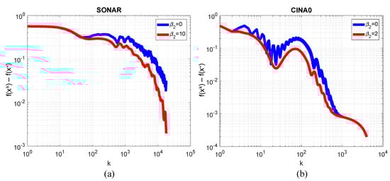 For the computations, we used two datasets: SONAR (, ) and CINA0 (, ). The first was used for a comparison of different methods in [36]. The second is a well-known test dataset, which can be downloaded from https://www.causality.inf.ethz.ch/challenge.php?page=datasets (accessed on 14 March 2024). The error was computed as . For the SONAR dataset, the values , , and were used, and a benchmark solution was obtained with method (4) in the case of iterations. For CINA0, the following parameters were used: , , and a benchmark solution was obtained for iterations of method (4). For both datasets, was chosen as a vector of zeroes.
