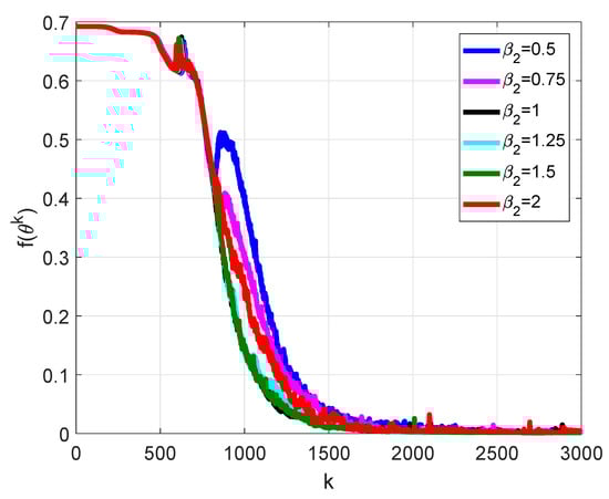 For minimization, we applied deterministic methods, as was considered in the theoretical part of the presented paper and despite the use of stochastic methods in most works on the training of neural networks. The computations were performed with , and we tried to vary the value of in order to analyze its effect on the convergence. We realized a numerical experiment for 250 random initializations of weights and biases and performed computations for epochs. In Figure 12, the plots of the dependence of the objective function value on the epoch number averaged at all random initializations are presented for the standard GD (2), HBM (3), and method (4) in the case of . As can be seen, methods with momentum led to a faster convergence in comparison with the standard GD, as mentioned by many authors (e.g., see [19]), and the presence of led to a faster convergence to the minimum in practice. In Figure 13, the plots obtained for different values of are presented. As can be seen, the value of had an effect on the convergence of method (4).