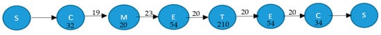 Nodes represent repetitive operations performed by workstations during the screening of each microplate. Capital letters within nodes identify workstations as follows: S for Storage Centre, C for Cytomat2C, M for Multidrop-384, E for Envision, and T for Teleshake. The numbers inside the nodes indicate the required time (in seconds) for the corresponding activity on the workstation. The arcs between nodes and the corresponding weights of the arcs denote the robot’s delivery operations and their durations (in seconds), respectively. The arcs between the Storage Centre and the Cytomat2C, and between the Cytomat2C and the Storage Centre, which are both of zero length, represent the delivery operations performed by the auxiliary transportation device.