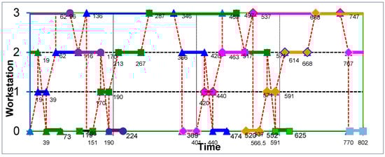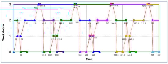 As seen previously in Figure 2, the robot’s movement is shown with a red dotted line. The numbers in the chart indicate the time the robot arrives at and leaves the corresponding workstations. The processing life of microplates is indicated by horizontal lines highlighted with small triangles, squares, and diamonds, respectively. The optimal two-cyclic schedule shown in Figure 5 is (T1, T2) = (151, 250).