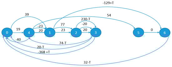 Now we can solve Problem Q for all robot routes repeatedly using the parametric critical path algorithm []. This part of the algorithm requires a routine repeated computation of a cycle time in graph GP for each available robot route, the total number of which is a small constant. Omitting the intermediate routine calculations for each candidate robot’s routes, we obtain the minimum 1-cyclic time T = 200.5, which is obtained for the robot route R = (O0, O4, O1, O2, O3) and β = 2. In this case, the constraints (1)–(4) have the following form: