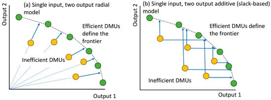 We consider two approaches to the estimation of the management option ‘efficiency’: an output-oriented radial DEA model [] and an output-oriented additive model (often referred to as a slacks-based model) [,,]. A simplified comparison of the two approaches is given in Figure 1, where the radial model results in a radial expansion to the frontier, while the additive model estimates the horizontal or vertical distance to the frontier. The radially (or additive) expanded inefficient DMU at the frontier may fall between two (or more in the case of multiple outputs) other DMUs (as seen in Figure 1), the position determined by the weighted average of the outputs of the efficient DMUs.