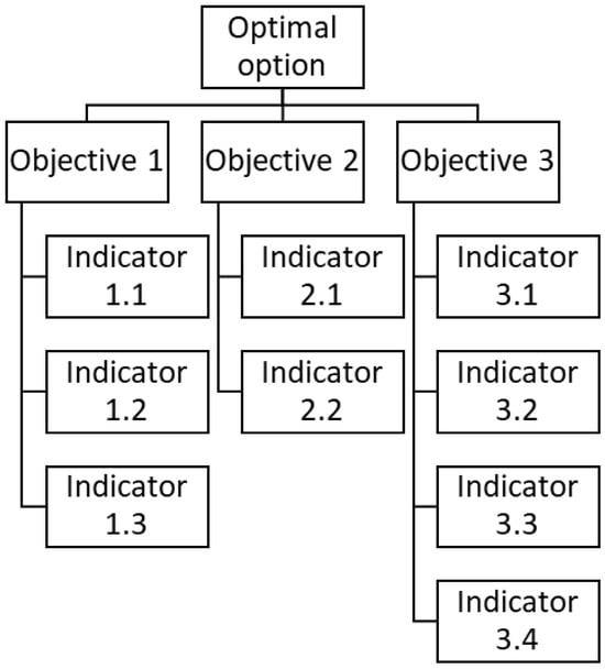 An example of such a hierarchy is given in Figure 2, in which three objectives have a different number of indicators (or measurable sub-objectives) associated with each. In this example, ignoring the hierarchical structure and comparing all indicators at the same time will implicitly give more weight to Objective 3 (as it has the most indicators) and least weight to Objective 2 (as it has the fewest associated indicators).