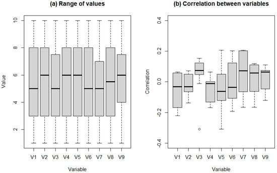 One hundred DMUs were randomly generated with each producing nine outputs (i.e., indicators) with a range of values from 1 to 10. The R code used to generate and analyze the data is presented in the Supporting Information. The range of values of each variable and the correlation between these values is illustrated in Figure 3. Correlation between the variables was low, generally less than +/−0.2.
