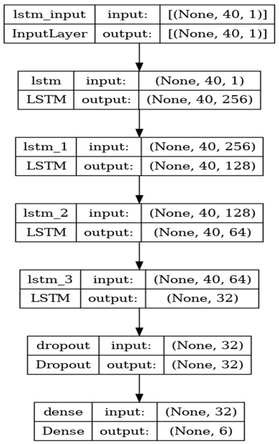 The GWO optimizer was introduced by Seyedali Mirjalili and Seyed Mohammad Mirjalili in 2014 [50]. GWO mimics wolf hunting strategies to solve optimization problems. It maintains a population of alpha, beta, delta, and omega wolves, updating their positions iteratively based on fitness and social interactions. GWO efficiently explores and exploits the search space through equations simulating hunting behavior. The methodology involves three steps: feature extraction, feature selection, and classification. Figure 1 displays the architecture of the conventional RNN-LSTM model for feature extraction and classification.