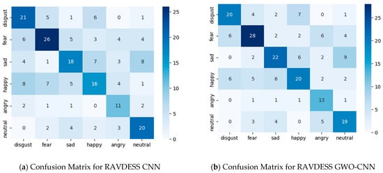 Figure 4a,b display the confusion matrix representing a set of emotions comprising six categories: anger, happiness, neutral, fear, disgust, and sadness for RAVDESS. The proposed model achieved an overall accuracy of 53% when evaluated using this particular emotion set and an accuracy of 60% when evaluated with the GWO technique. Upon analyzing the confusion matrix (Figure 4a,b), it becomes apparent that the accuracy rates for the fear and neutral classes are relatively high compared to those of the other classes. In contrast, the angry class exhibits a lower classification accuracy. Additionally, there is a significant misclassification of neutral as sad and disgust as happy. Despite the underperformance of the angry class, the proposed model demonstrated effective distinction among the other emotions within this emotion set. Figure 4b displays the classification after using GWO, which, as can be seen, lowers the misclassifications by a small degree.