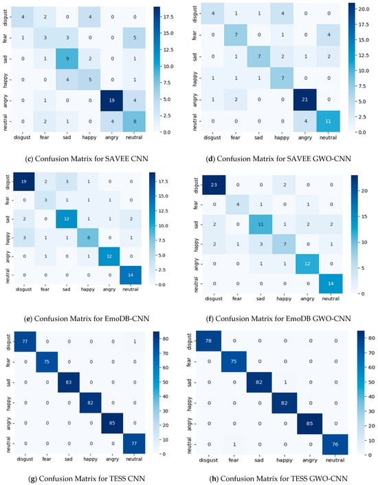 The confusion matrix of GWO-CNN and CNN model was tested on four datasets—RAVDESS, SAVEE, TESS, and EMODB.