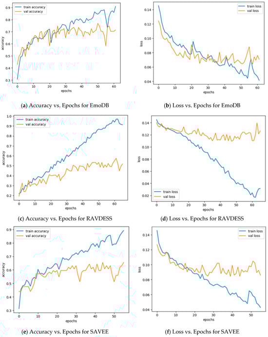 The accuracy and loss by epochs on four different datasets—RAVDESS, SAVEE, TESS, and EMODB, they should be listed as: (5 (a–h)).