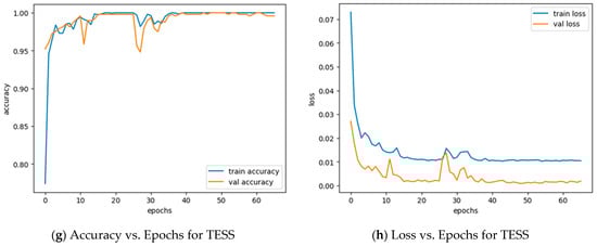 Figure 5g shows the accuracy graph for the TESS dataset. There is again an exception to note, namely that the TESS dataset being balanced and great for SER produces excellent results. The accuracy climbs to greater than 95% within the first five epochs and then saturates around the 99% mark, ranging from 99.1% to 99.73% on training and validation. This is shown in the loss graph (Figure 5h) as well, which shows the loss nearing 0.01 as the epochs progress. The TESS dataset exhibits the highest values in all the parameters measured, with an average value of 99% in F1-score, precision, recall, and accuracy.