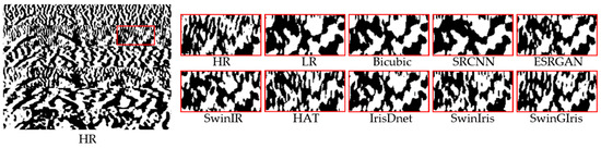 | LR | SRCNN | ESRGAN | SwinIR | HAT | IrisDnet | SwinIris | SwinGIris | |