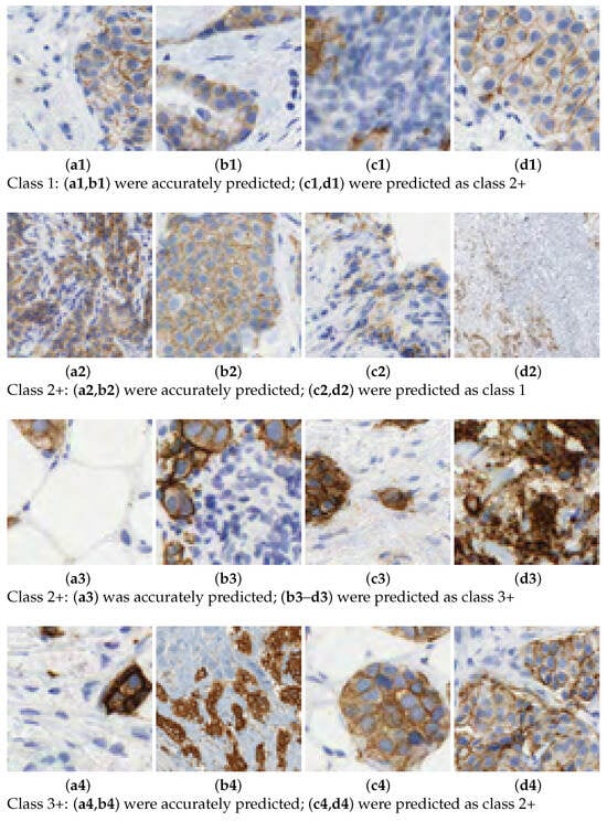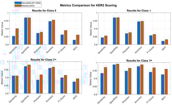 Table 11 indicates that DS3 generates a higher level of confidence in comparison to DS2, particularly for our most advanced models. Because of this, the 7-class method provides advantages not only in terms of sensitivity but also in terms of the levels of confidence it provides. According to the results of our experiments, the ResNet model in DS3 is the one that performs the best when it comes to HER2 prediction. In general, it demonstrates a high level of sensitivity (91%), and it also demonstrates higher levels of confidence, ranging from 87% to 97%. In contrast, the DenseNet model is a little bit behind the curve, with confidence levels ranging from 84% to 92%.