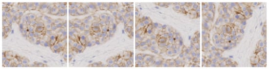Colour transfer: the aim is to artificially produce colour variation patches within the range of colours observed in the different slides. By adapting the colour of one image to another, patches with new colour appearance are generated, as shown in