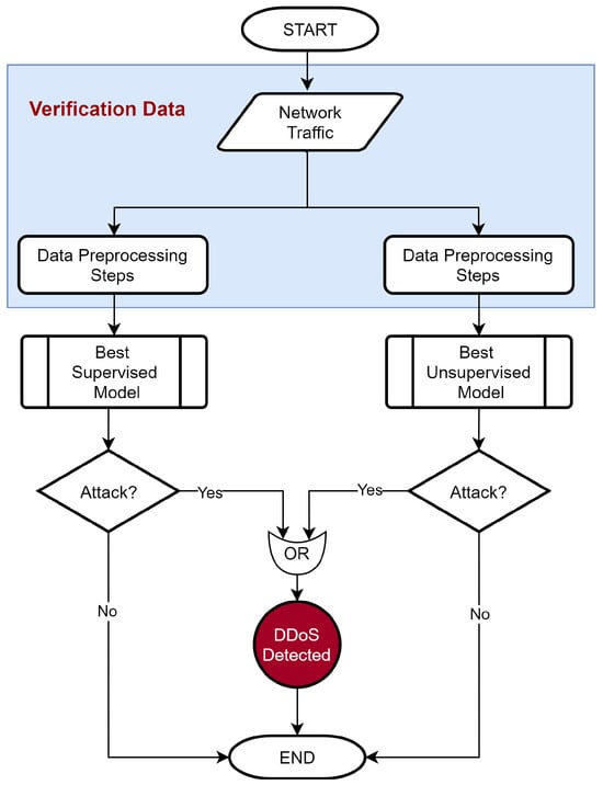 Once the individual and ensemble classifier models are trained in the previous phase and the best-performing supervised and unsupervised models are identified, these models then can be deployed on the perimeter of a real-world network to detect DDoS intrusions as part of an IDS. Figure 3 depicts the flowchart of the DDoS detection mechanism using these models in the ensemble framework. The network traffic undergoes data preprocessing steps, where they are sanitized, feature-reduced, and then classified by the ensemble framework that detects any DDoS attack and provides an alert regarding it.