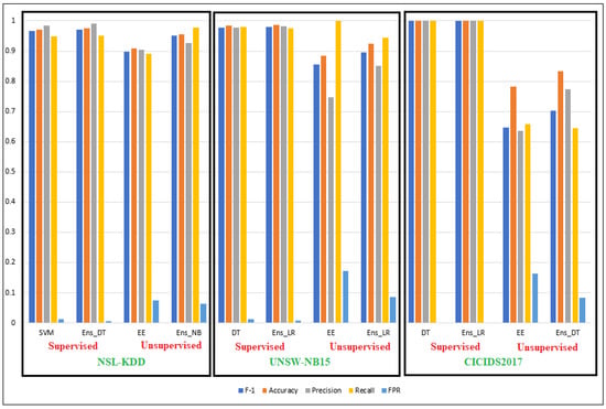The performance of all individual classifiers and their respective ensemble models were measured and compared using standard model evaluation metrics, which are detailed in Section 7.1. Thus, the best-performing supervised and unsupervised models were identified and chosen from the two different ensemble frameworks, resulting in one from each model type (i.e., supervised and unsupervised).