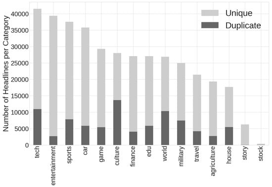 Because this dataset was from an aggregator and it was possible the site captured the same article from multiple sources, a search for duplicate headlines was conducted. The result of this search is displayed in Figure 1, which is a countplot generated from the 15 topic categories and gives insight into a flaw in the dataset—an excessive number of duplicate entries in certain categories. There are a total of 86,195 duplications (22.5% of the dataset), which can cause an inaccurate calculation of model metrics and result in models inappropriately focusing more on high-duplicate categories such as culture. Figure 1 also highlights a class imbalance, especially for the story and stock categories.
