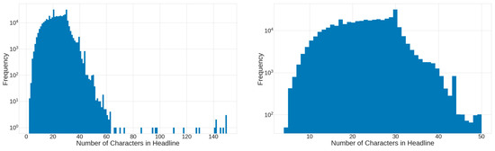 - Standardize headline length: The lengths of the headlines were examined, and they varied from 2 to 150 characters in length. The median headline length was 23 characters, with the smallest median of 18 for the culture category and the longest of 28 for the story category. A plot of frequency vs. headline characters is shown in Figure 2. The left side of the figure shows a countplot of the number of characters in all headlines. This variation was adjusted by removing headlines that exceeded 50 characters in length or were shorter than 3 characters. The right side of Figure 2 shows the countplot after these headlines are removed.
