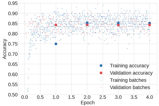 A Bidirectional Encoder Representation from Transformers (BERT) model instance from Hugging Face was fine-tuned on the dataset [36]. This encoder-based model was from the BERTforSequenceClassification family, and the number of inputs was specified based on the number of labels in the dataset. The dataset was split into 80% train and 20% holdout sections, stratified amongst the labels. To minimize RAM usage, a DataLoader was used with a maximum batch size of 128, and shuffle = True. The bert-base-chinese tokenizer was trained on the dataset, and the neural networks were trained using TensorFlow and PyTorch. A decoupled weight decay regularization optimizer (AdamW) was specified [37], and multiclass accuracy was calculated on the training and validation datasets to monitor for overfitting. The training process was lengthy, and both the epoch-level accuracy and batch-level accuracy for a BERT training run are shown in Figure 4. As shown in the figure, it was common for the accuracies to stabilize at 2 epochs, so that was selected as the epoch hyperparameter. A limited hyperparameter sweep of learning rates and batch sizes was conducted to find that the best performance resulted in a learning rate of 2 × 10−5 and a batch size of 32. With the low batch size, each 2-epoch training run took approximately 3 hours.