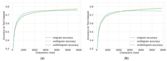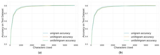 Similar to the Multinomial Naïve Bayes algorithm, a sweep of vocabulary and tokenization was conducted using the ensemble XGBClassifier algorithm. Figure 7 shows the results for the character-level modeling; the results were similar for CountVectorizer (a) and TF-IDF vectorization (b) methods. The performance plateaued near 2000 tokens, and the best character-level model used the full 5888-token vocabulary. This model used the CountVectorizer, unigrams/bigrams and achieved 81.0% accuracy.