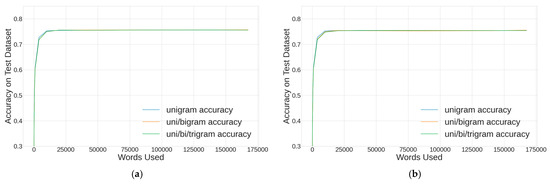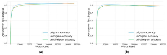 For word-level tokenization, the hyperparameter sweep was repeated and the results are presented in Figure 6. The approach differed from the character-level tokenization by exploring the full vocabulary of the 167,506 tokens that resulted from applying the jieba method. Again, the results were similar for CountVectorizer (a) and TF-IDF vectorization (b) methods. The best model used the CountVectorizer, unigrams with an 84,025-token vocabulary and possessed 82.8% accuracy.