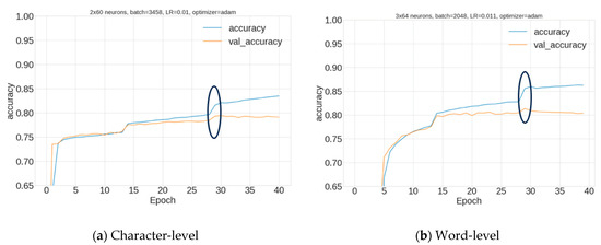 Models were saved during optimization, and the best model’s train/validation curves are shown in Figure 9 for the best character-level (a) and word-level (b) models. Both sets of curves show the model is exhibiting normal training behavior. The impact of the decreasing learning rate is visible in Figure 9, which halves every 15 epochs of training and enables a small boost in performance at 15 and 30 epochs. Also, the early stopping callback allowed the model to be saved at the highest validation performance, which is denoted by the black oval. This enables the model to avoid higher levels of overfitting.