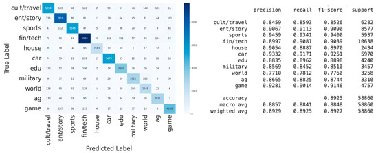 The detailed model performance of the tuned BERT algorithm is presented in Figure 10, with the confusion matrix on the left and the classification report on the right. The model performed fairly consistently on the test/holdout dataset across all categories, with the exception of the world category, which possessed F1 = 77.6%. On the left side of the figure, the model had the highest level of confusion between the military and world categories and between the finance/technology and car categories.