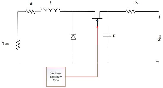 The load model includes a buck converter that demonstrates the customer’s usage pattern by dissipating power. The stochastic load model is illustrated in Figure 3. At the coupling point between the load and the DC microgrid, there is a capacitor that charges from the main bus. Once it is fully charged, it discharges into the buck converter, which serves to model the load of the system.
