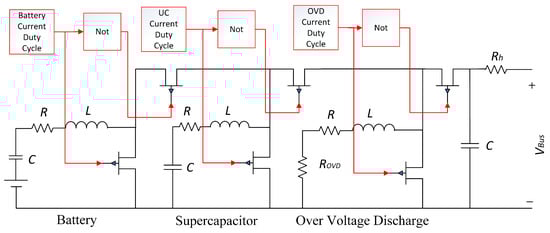 The DC microgrid’s stabilizer model includes three main parts: the EV battery, supercapacitor, and over-voltage discharge. An EV battery and a supercapacitor are connected to the DC microgrid through a buck–boost converter. The boost converter is active during charging, and the buck converter is active during discharging. However, the role of the overvoltage discharge unit, which only has a buck converter, is to waste excess voltage. The over voltage discharge (OVD) unit engages when batteries and supercapacitors are fully charged, preventing overcharging. It is linked to a buck converter, managing surplus PV generation by dissipating extra voltage. Each stabilizer converter has one transistor, controlled by a controller discussed in the following section. The stabilizer unit structure is demonstrated in Figure 4.