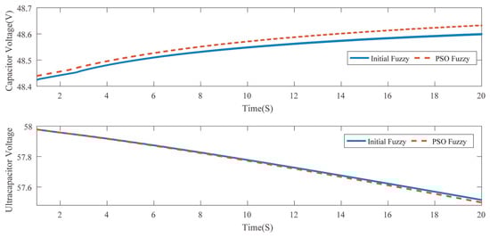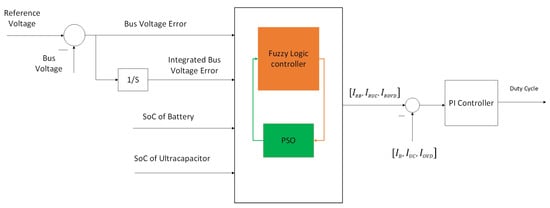 Our proposed controller in this work is a fine-tuned version of the fuzzy controller using particle swarm optimization (PSO). More specifically, our approach merges fuzzy logic and PSO, optimizing both the expectation and standard deviation of the fuzzy controller’s membership functions. The fuzzy controller incorporates four inputs: bus voltage error, integral of bus voltage error, battery state of charge (SoC), and supercapacitor state of charge (SoC). From these inputs, the fuzzy controller generates current references for the battery, supercapacitor, and overvoltage discharge (OVD). Three low-level PI controllers process reference values and generate duty cycles for stabilizer components based on actual component currents.