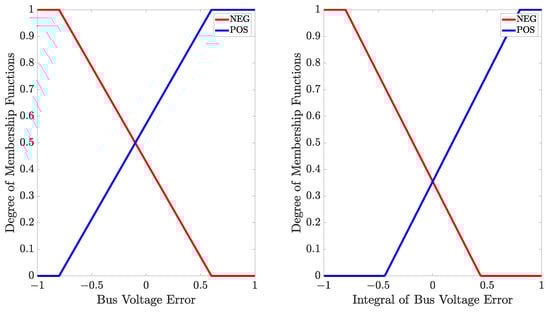 Similar to [35,36], the primary fuzzy controller’s membership functions are initially untrained. However, in the trained version, they undergo fine-tuning via PSO to achieve the objectives of ripple minimization and battery lifetime expansion. Figure 6 shows the membership function of the bus voltage error and the membership function of the integrated bus voltage error. Two membership functions, negative (NEG) and positive (POS), are considered for each input. The NEG is designed to manage negative voltage ripple, whereas the POS is employed to address positive voltage ripple. It is worth mentioning that the currents and voltages are normalized before feeding into the fuzzy inference system. The fuzzy controller functions effectively by taking two parameters as inputs: the integral of voltage error and the voltage error itself. This enables the algorithm to discern alterations that could influence the bus voltage, aiding in the preservation of the nominal voltage level. The input associated with the voltage error promptly reacts to rapid fluctuations, whereas the integral term identifies prolonged changes. Consequently, the fuzzy controller initiates responses to counteract and rectify any deviations in the bus voltage. This dual-response mechanism empowers the DC microgrid to address both swift and gradual alterations, thereby widening its bandwidth and enhancing its ability to promptly adapt to varying conditions.